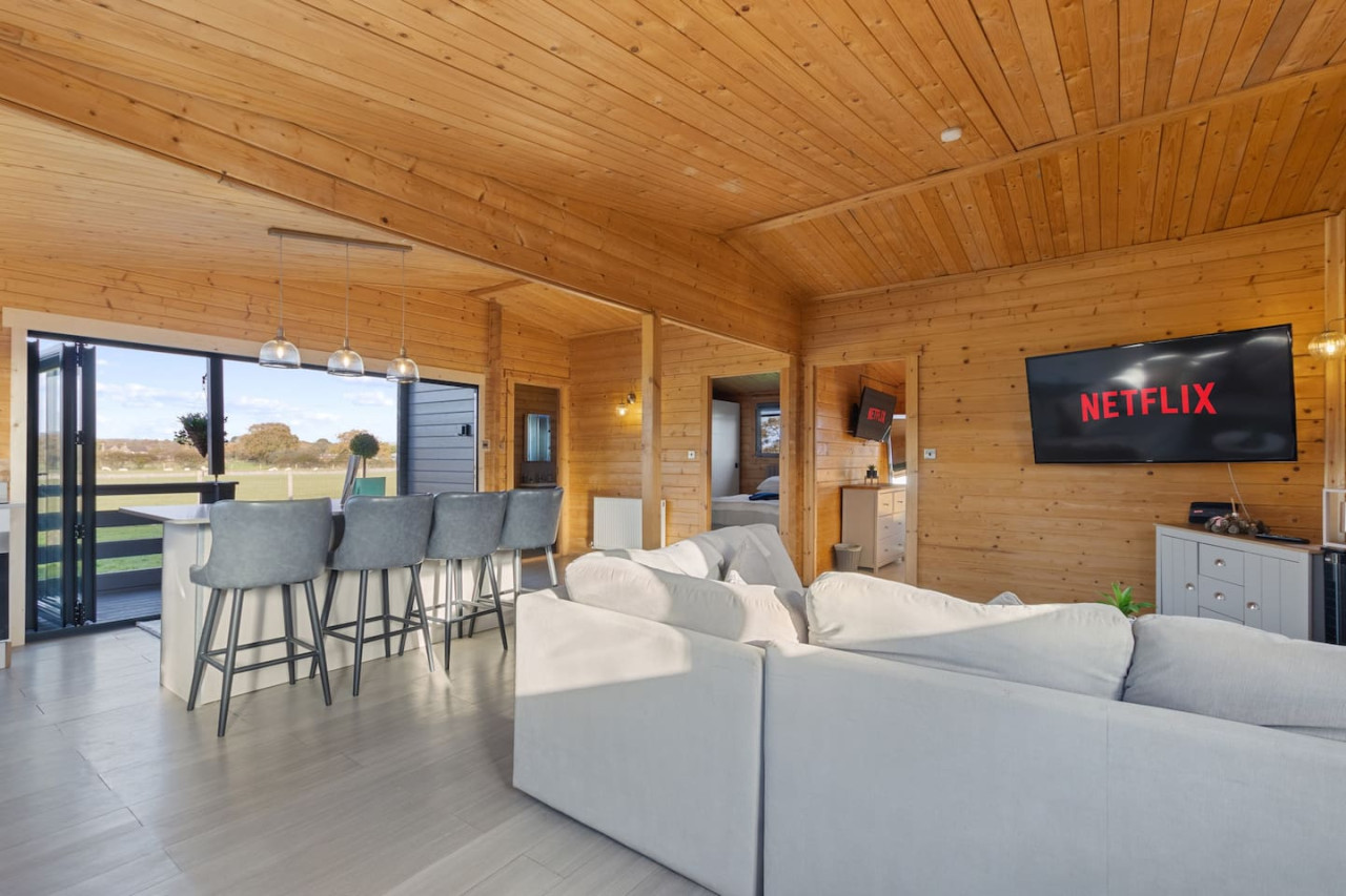 Located on a peaceful farm in the heart of Sussex, Choller Lodge offers a comfortable home away from home. The lodge comes with everything you need for a relaxing stay, including bedding, towels, a fully equipped kitchen, two TVs (including a 60 inch screen), and access to a picturesque fishing lake on the property. Choller Farm welcomes guests to enjoy fishing in the stocked lake at any time during their stay. The variety of fish includes Carp, Rudd, Perch, Tench, and Roach, and all guests of Choller Farm have access to the lake. Please be considerate of other guests as the cabin is located next to another log cabin. The cabin is situated on a working farm with friendly farm animals and active machinery.