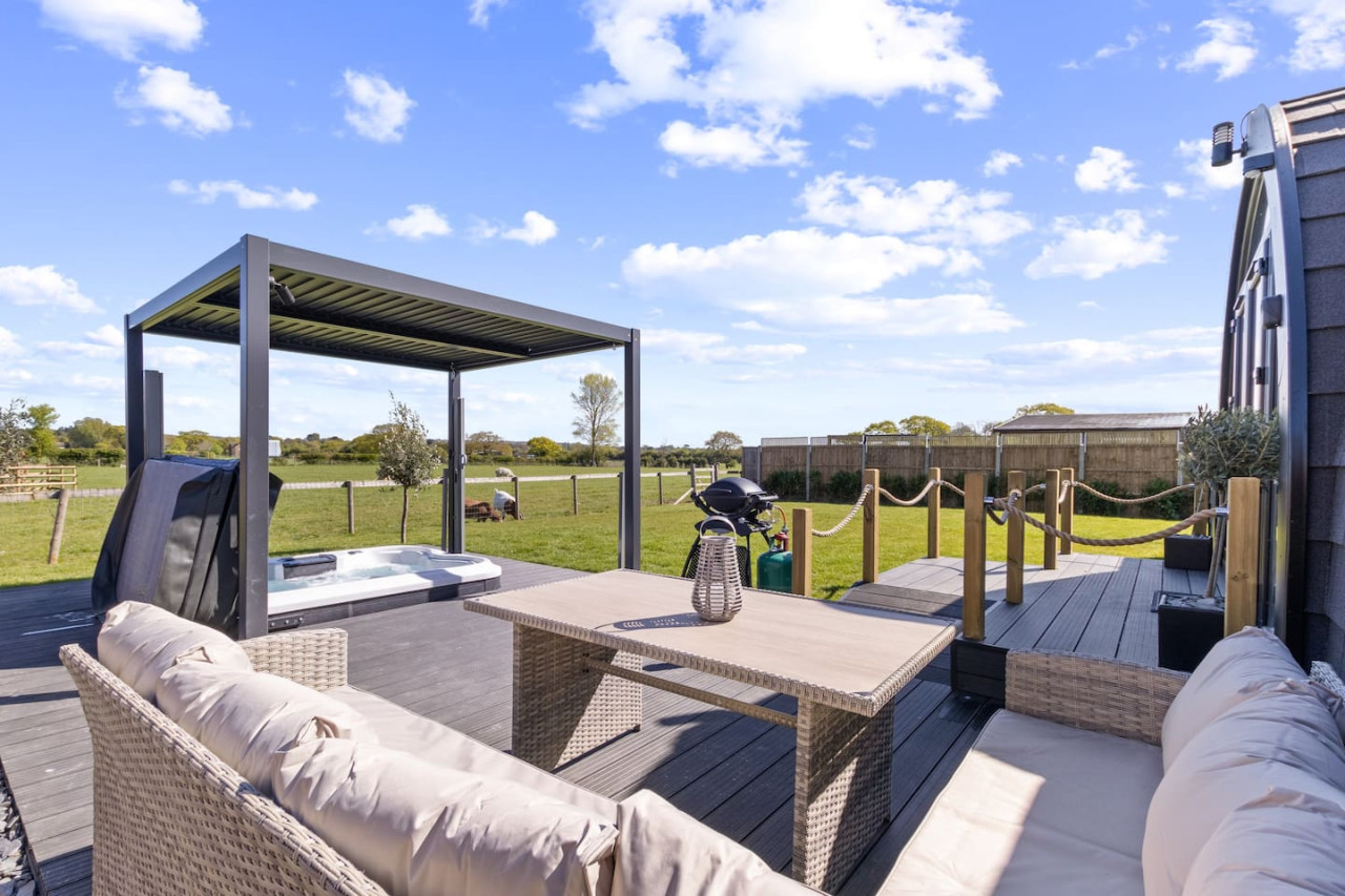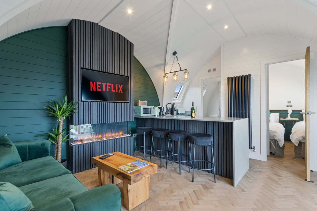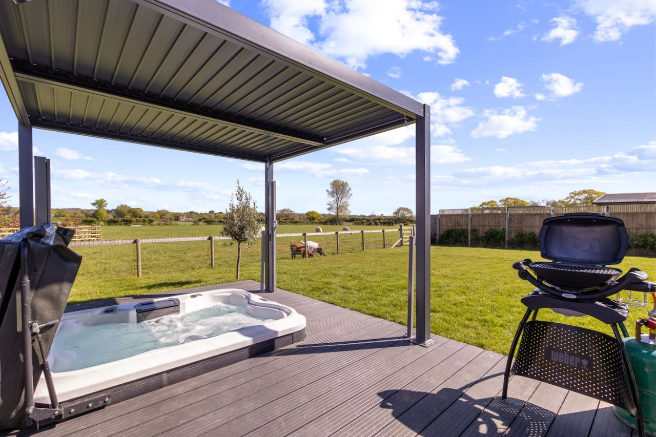 Experience the charm of The Barn House, a newly crafted opulent pod accommodating up to 6 guests. Nestled on a Farm in the Sussex countryside, surrounded by farm animals, it’s an ideal haven for families, friends, and even furry companions. Delight in a spacious private garden, hot tub, a scenic veranda boasting breathtaking views, and a captivating on-site fishing lake. This stylish place to stay is perfect for group trips.