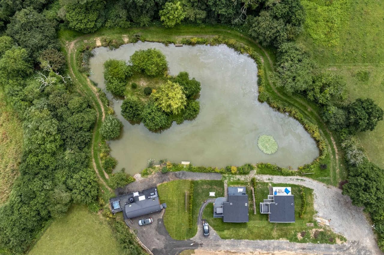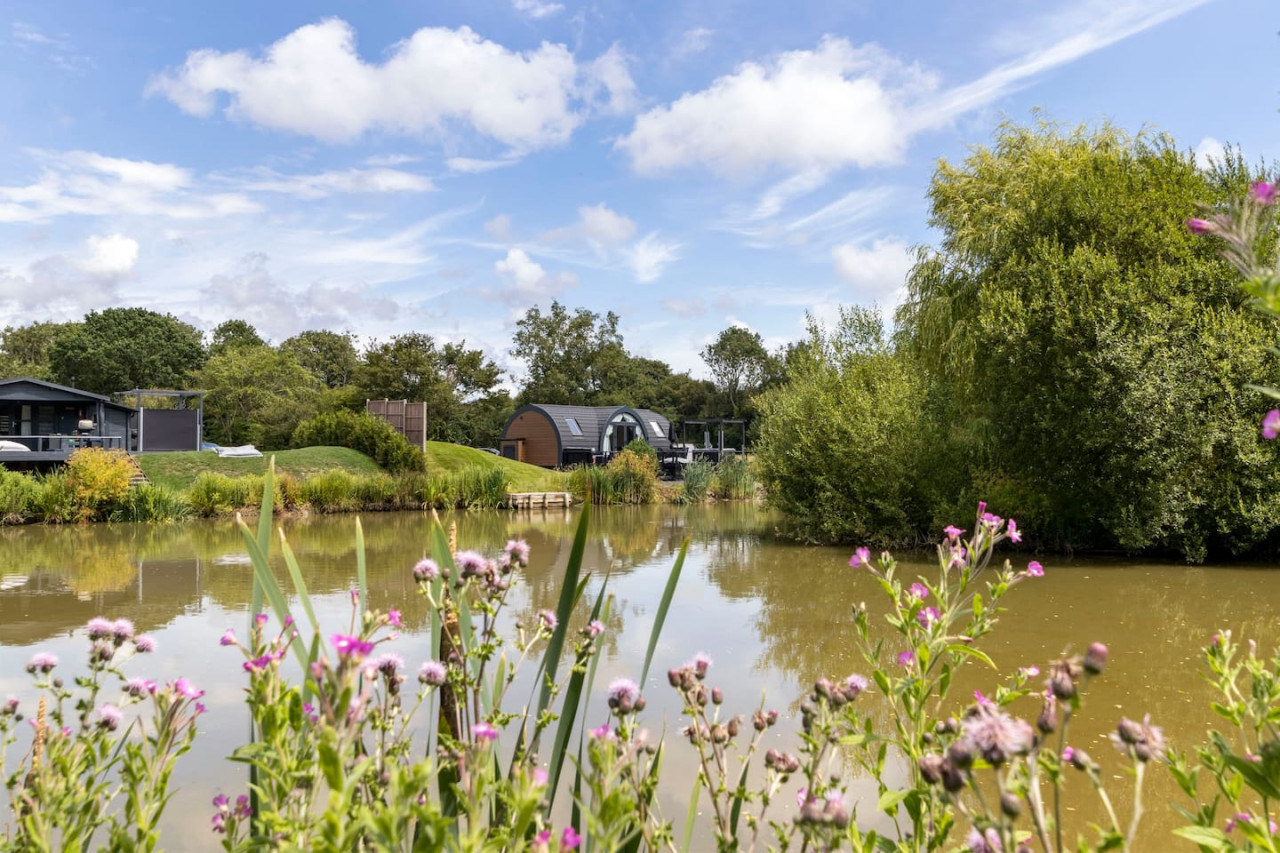 Embrace the tranquillity of awakening to the allure of a fishing lake & farm animals.